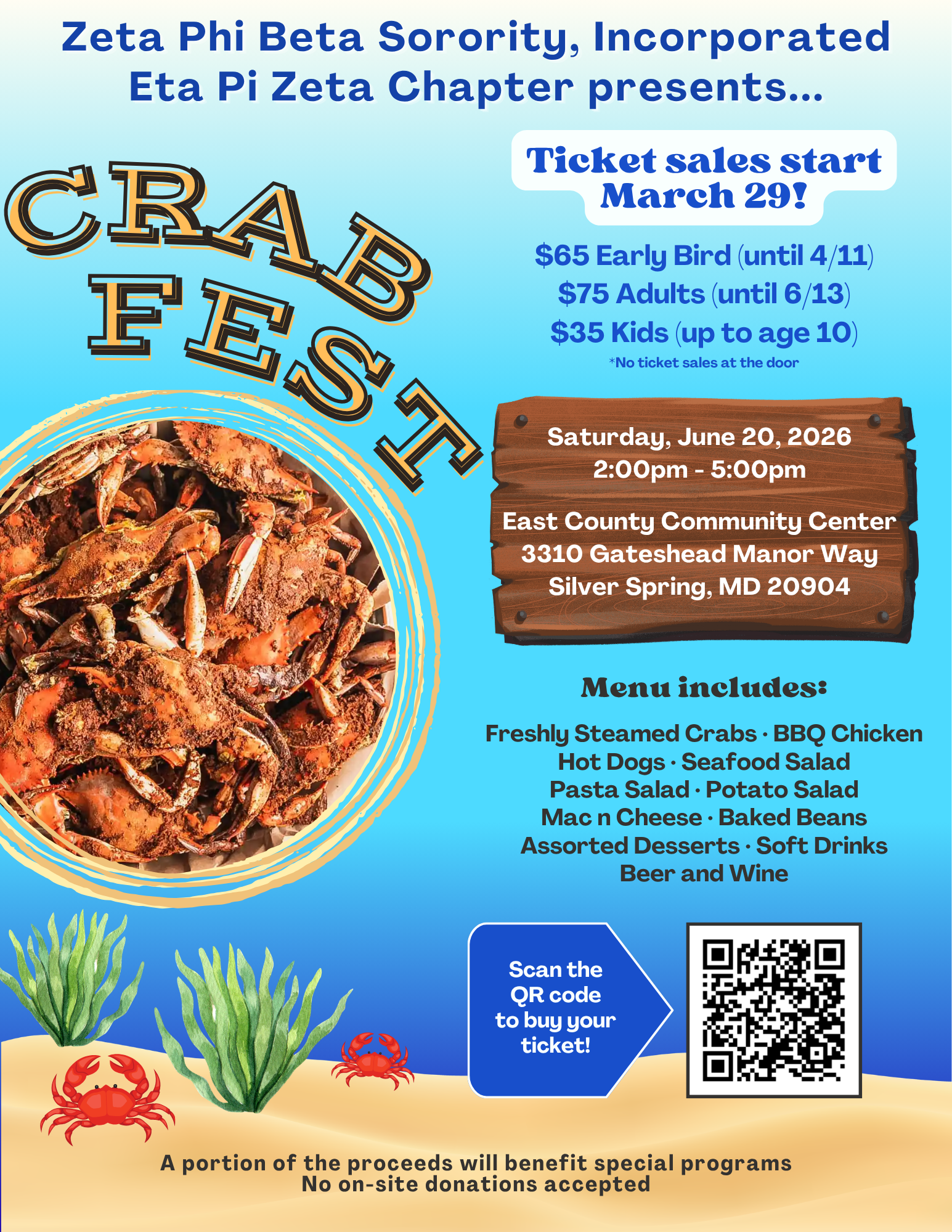 Buy your ticket for the annual Crab Fest event on Saturday, June 20 from 2-5pm at the East County Community Center (3310 Gateshead Manor Way, Silver Spring, MD 20904).